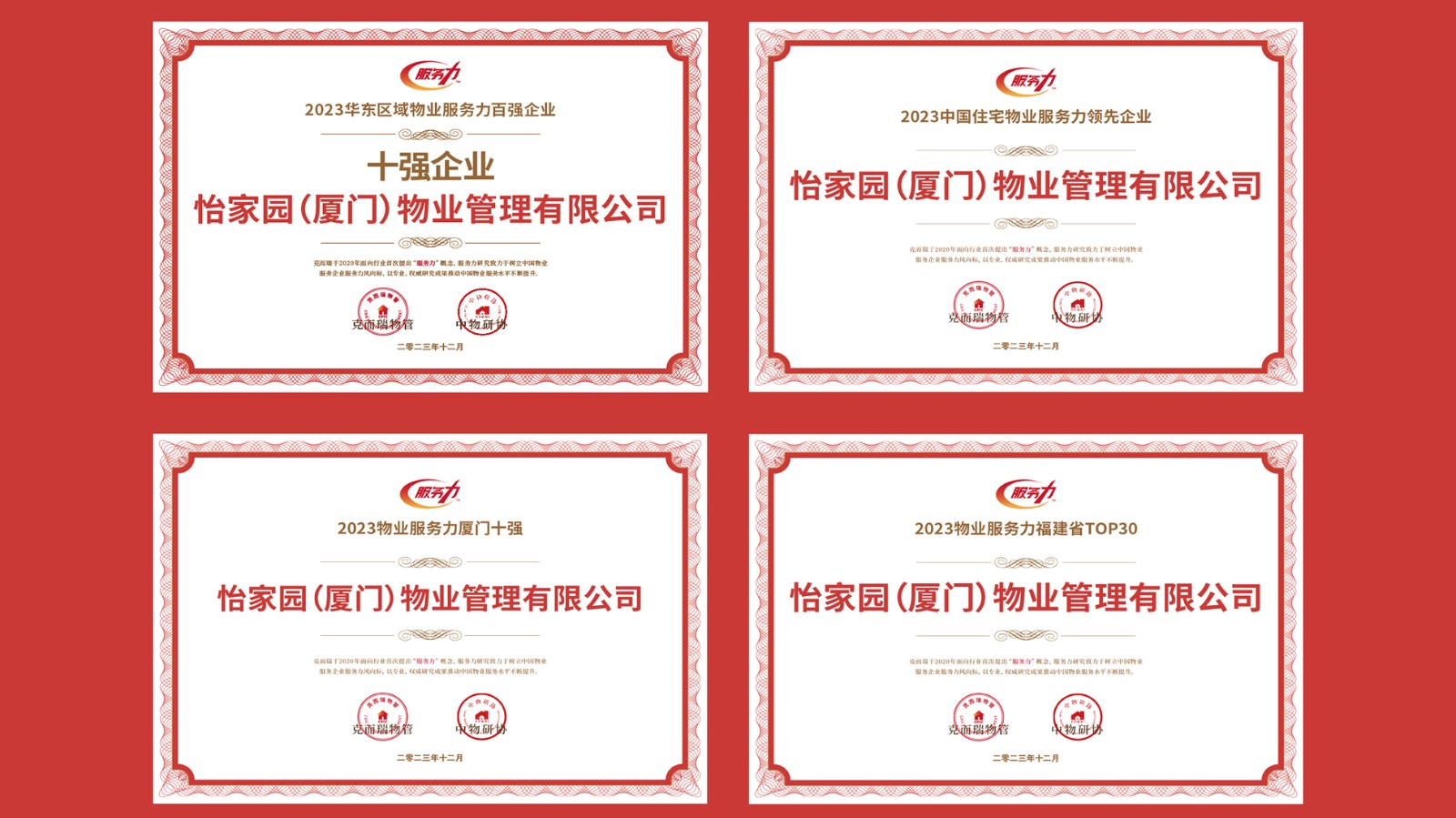 Recently, at the "2023 East China Regional Brand Strategy Innovation Annual Meeting" hosted by CRIC and China Property Management Research Institute, Yijiayuan Property under C&D Properties was honored with several awards, including "7th Place among the Top 100 Property Service Enterprises in East China in 2023," "1st Place in Property Services in Fujian Province in 2023," "1st Place among Leading Residential Property Service Enterprises in China in 2023," and "1st Place among the Top Ten Property Service Enterprises in Xiamen in 2023.” Lianfa Property was ranked "2nd among the Top Ten Property Service Enterprises in Xiamen in 2023.”